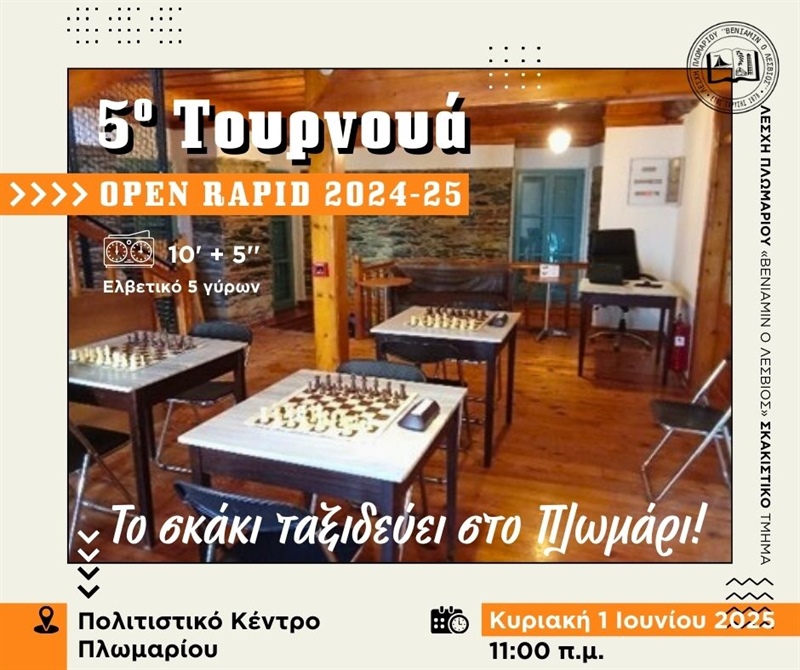 Η Λέσχη Πλωμαρίου «Βενιαμίν ο Λέσβιος», στο πλαίσιο της Σκακιστικής εκπαιδευτικής χρονιάς 2024-25 της Ακαδημίας της, διοργανώνει το 5ο Σκακιστικό Τουρνουά open rapid Βενιαμίν 2024-25 στο Πλωμάρι.
